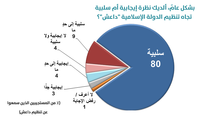 لقد أظهرت نتائج المؤشر العربيّ أنّ الرأي العام العربي شبه مجمعٍ، وبنسبة 89% من المستجيبين، على رفض تنظيم الدولة (داعش)، مقابل 7% أفادوا أنّ لديهم نظرةً إيجابيةً جدًا وإيجابيةً إلى حدٍ ما تجاهه. إنّ الذين يحملون نظرةً إيجابيةً نحو تنظيم داعش لا ينطلقون من اتفاقهم مع ما يطرحه التنظيم من موقفٍ وآراء ونمط حياةٍ؛ إذ إنّ نسبة الذين يحملون وجهة نظر إيجابية نحو داعش بين المتدينين جدًا هي شبه متطابقة مع النسبة عند غير المتدينين، وهي متطابقة بين الذين يعتبرون أنّ الممارسات الدينية هي ممارسات خاصة يجب فصلها عن الحياة العامة وبين من يعارضون ذلك، كما أنها متطابقة أيضًا بين الذين يقبلون بالسماح للبنوك باستخدام الفائدة وأولئك الذين لا يقبلون، وشبه متطابقة بين الذين يؤيدون فصل الدين عن السياسة والذين لا يؤيدون ذلك.