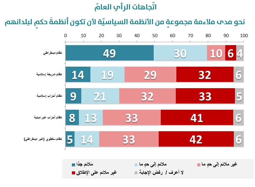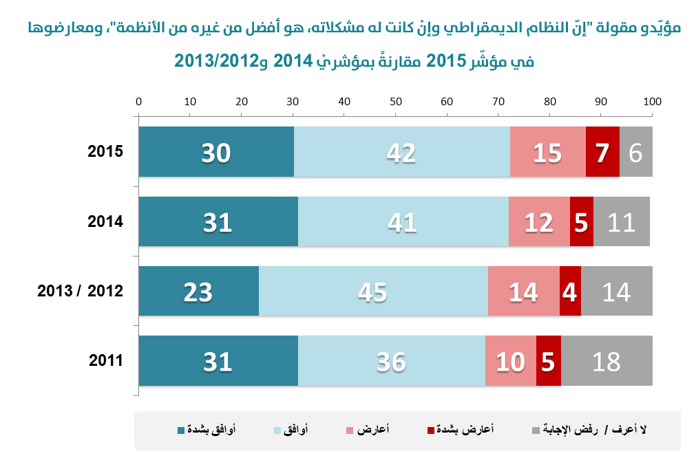 الرأي نحو الديمقراطية، فإنّ هنالك شبه إجماع؛ إذ عبّر 72% من المستجيبين