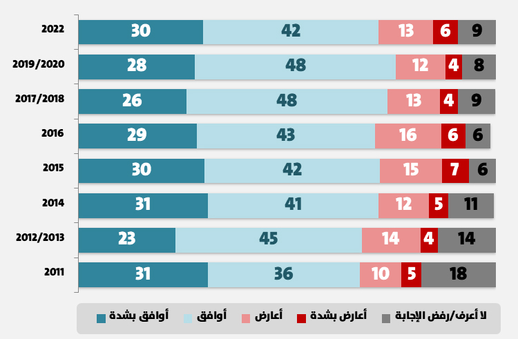 مؤيّدو مقولة "إنّ النظام الديمقراطي وإن كانت له مشكلاته، هو أفضل من غيره من الأنظمة"، ومعارضوها في استطلاعات المؤشر عبر السنوات السابقة