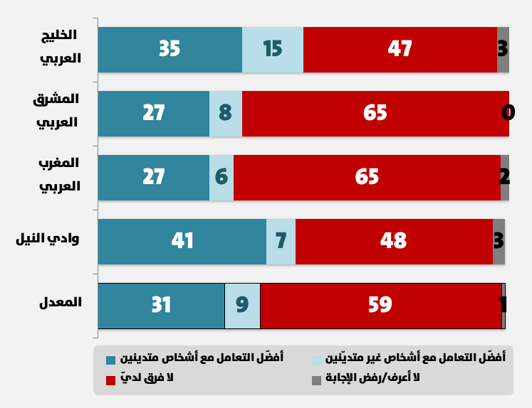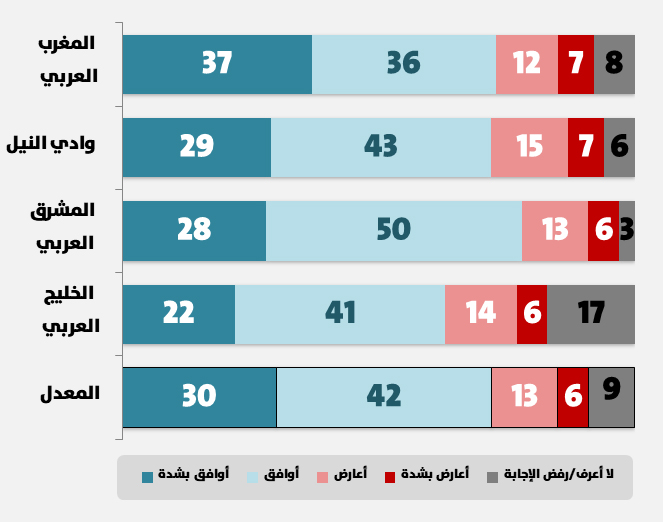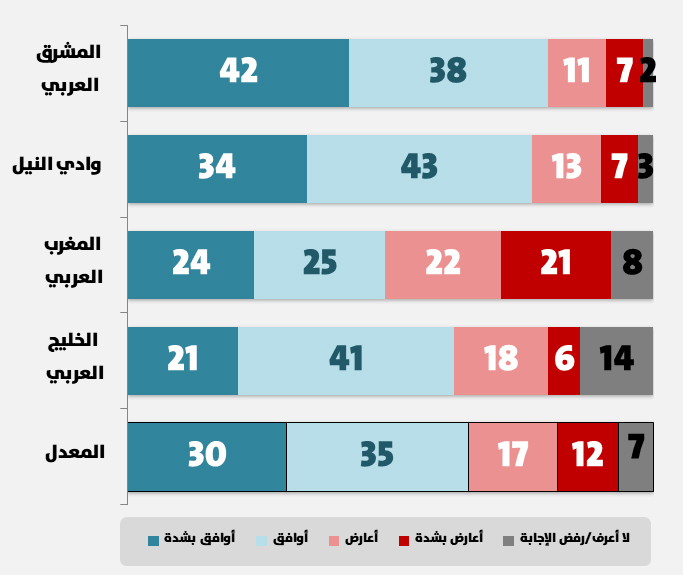 مؤيّدو مقولة "لا يحقّ للحكومة استخدام الدّين للحصول على تأييد الناس سياساتها"، ومعارضوها بحسب أقاليم المنطقة العربية