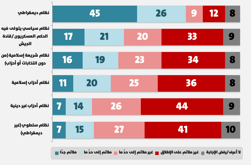 أفاد 71% من المستجيبين أنّ النظام الديمقراطي التعددي ملائم ليطبَّق في بلدانهم. في حين تَوافَق ما بين 53% و70% على أنّ أنظمة مثل: النظام السلطوي، أو نظام يتولى الحكم فيه العسكريون، أو حكم الأحزاب الإسلامية فقط، أو النظام القائم على الشريعة من دون انتخابات وأحزاب، أو النظام المقتصر على الأحزاب العلمانية (غير الدينية)، هي أنظمةٌ غير ملائمة لتطبَّق في بلدانهم. إن مقارنة نتائج هذا الاستطلاع بالاستطلاعات السابقة، تُظهر أن انحياز الرأي العام إلى الديمقراطية لا يزال ثابتًا.