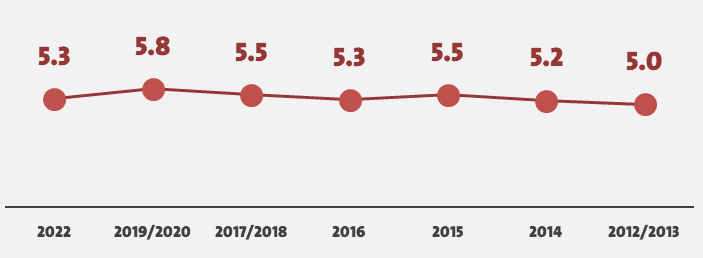 وقد قابل توافق الرأي العام على تأييد الديمقراطية، تقييمٌ سلبي لواقع الديمقراطية ومستواها في البلدان العربية؛ إذ قيّم المستجيبون مستوى الديمقراطية بـ 5.3 درجات من أصل 10 درجات؛ أي إن الديمقراطية في العالم العربي بحسب وجهة نظرهم لا تزال في منتصف الطريق. إن تقييم الديمقراطية في مؤشر 2022 هو أقل من ذلك الذي سُجّل في استطلاع 2019/ 2020.