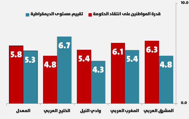 إن تقييم مستوى الديمقراطية من خلال تقييم المواطنين لقدرتهم على انتقاد حكومات بلدانهم على مقياس من 1 إلى 10 درجات أظهر أن قدرتهم على انتقاد حكوماتهم محدودة؛ إذ إنهم منحوها 5.8 درجات من أصل 10 درجات. وحصلت مصر وفلسطين والسعودية على أقل الدرجات على هذا المقياس.
