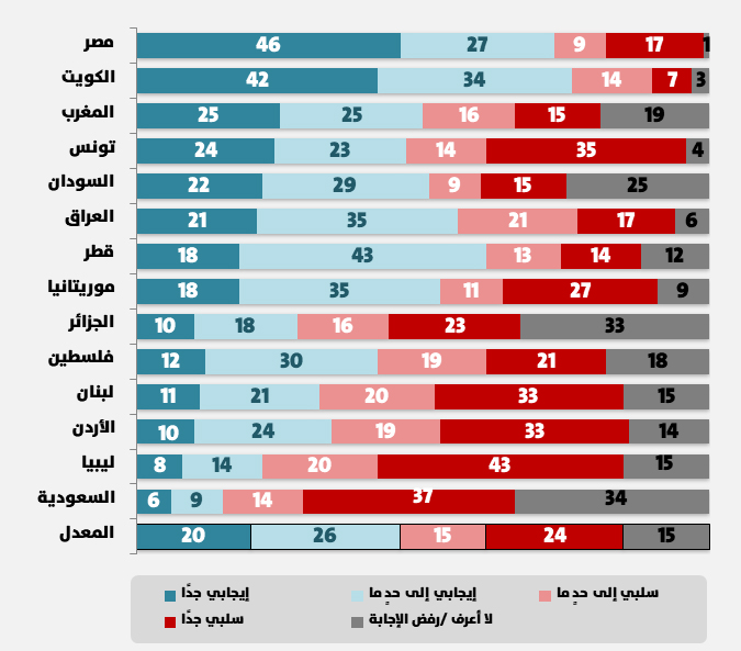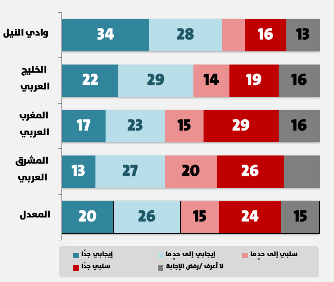 أظهرت النتائج أن الرأي العام منقسم نحو تقييم الاتجاه الذي تسير فيه بلدانه، ففي حين أفاد 52% أن الأمور في بلدانهم تسير في الاتجاه الخاطئ، رأى 42% أنها تسير في الاتجاه الصحيح.
