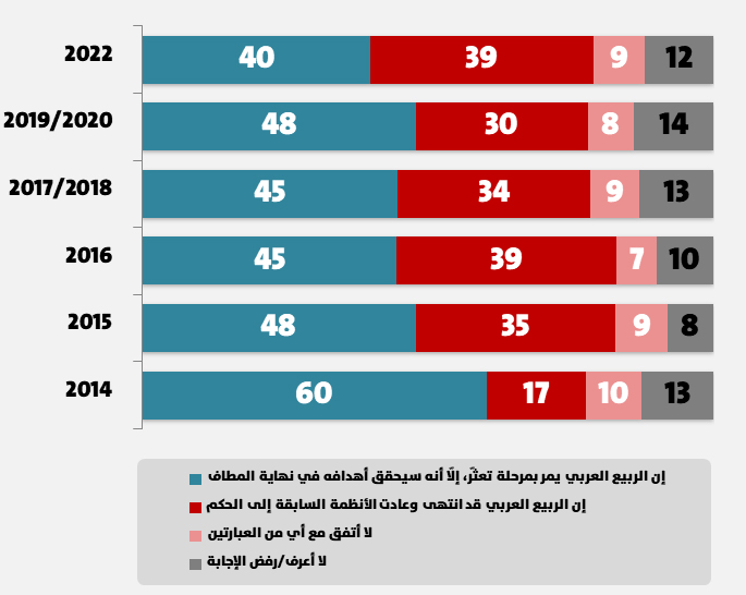 انقسم الرأي العامّ العربي بين متفائل ومتشائم نحو واقع ثورات الربيع العربي ومستقبلها؛ إذ أفاد ما نسبته 40% أنّها تمرّ بمرحلة تعثّر، إلّا أنّها ستحقق أهدافها في نهاية المطاف، وذلك مقابل 39% يرون أنّ الربيع العربي قد انتهى وأنّ الأنظمة السابقة عادت إلى الحكم.