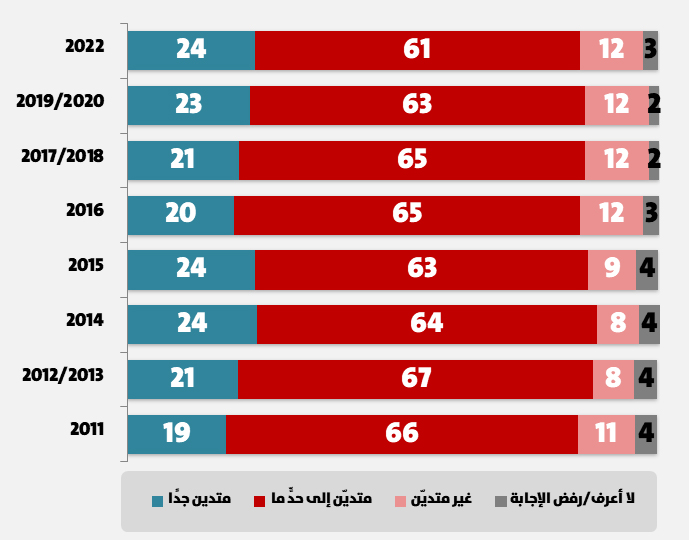 بالنسبة إلى درجة التدين، أظهرت النتائج أنّ مواطني المنطقة العربية منقسمون إلى ثلاث كتل؛ فالكتلة الأكبر هي التي وصفت نفسها بأنها متديّنة إلى حدٍ ما وبنسبة 61%، أما الكتلة الثانية فهي التي أفاد المستجيبون فيها أنهم "متدينون جدًّا" (24%)، بينما قال 11% إنهم "غير متديّنين".