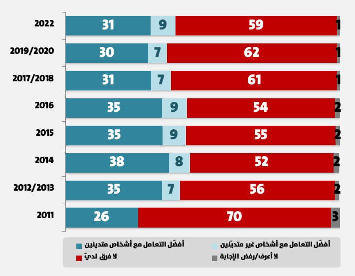 ترفض أغلبية الرأي العامّ بنسبة 65% تكفير من ينتمون إلى أديان أخرى، وكذلك ترفض وبنسبة 69% تكفير من لديهم وجهات نظر مختلفة في تفسير الدين. كما تشير النتائج إلى أنّ أكثرية المواطنين بنسبة 59% لا تميّز في التعامل الاقتصادي والاجتماعي والسياسي سلبيًا أو إيجابيًا بين المتديّنين وغير المتديّنين. وترفض الأكثرية بواقع 72% أن تقوم الدولة باستخدام الدين للحصول على تأييد الناس لسياساتها، كما رفضت أن يستخدم المترشّحون للانتخابات الدينَ من أجل كسب أصوات الناخبين.