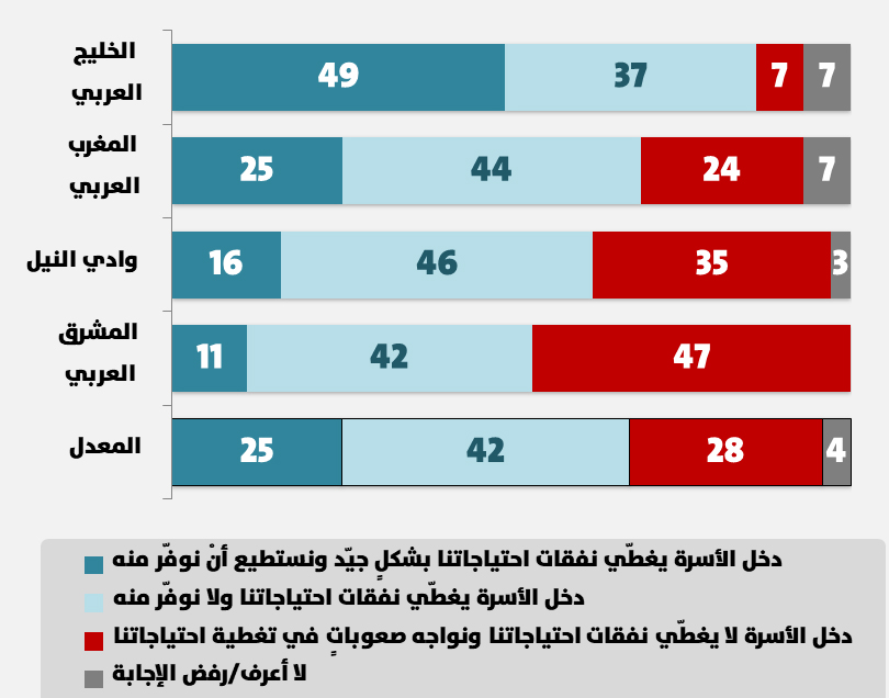 وكشفت نتائج المؤشر العربي أنّ الأوضاع الاقتصادية لمواطني المنطقة العربية هي أوضاع غير مرضية على الإطلاق؛ إذ إنّ 42% قالوا إنّ دخول أسرهم تغطّي نفقات احتياجاتهم الأساسية، ولا يستطيعون أن يدخروا منها (أسر الكفاف)، وأفاد 28% من المستجيبين أنّ أسرهم تعيش في حالة حاجةٍ وعوز؛ إذ إنّ دخولهم لا تغطّي نفقات احتياجاتِهم. وتعتمد أغلبية أسر العوز على المعونات والاقتراض لسد احتياجاتها. وباستثناء مستجيبي بلدان الخليج، فإن أغلبية مواطني البلدان العربية هم ممن يقعون ضمن أسر "الكفاف" أو أسر "العوز".