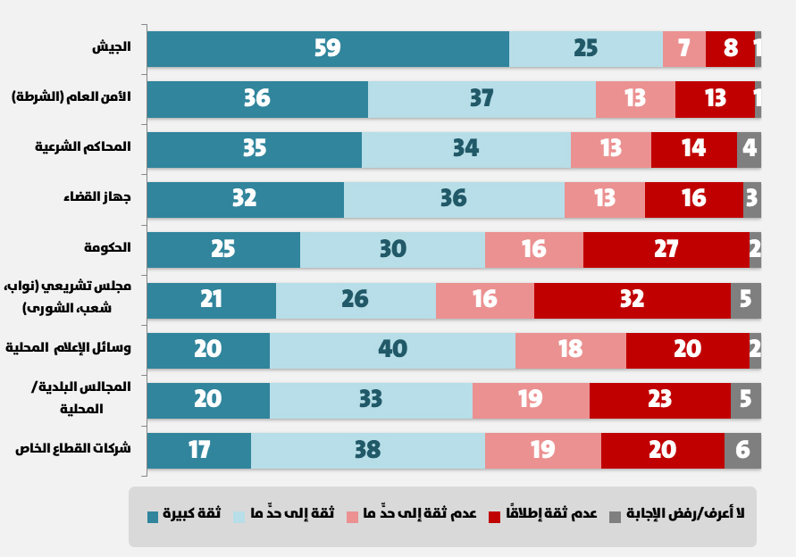 عكست النتائج أن ثقة المواطنين بمؤسسات الدولة في بلدانهم متباينة، ففي حين أن ثقتهم مرتفعة وبخاصّة بمؤسسة الجيش والأمن العام، فإنّ