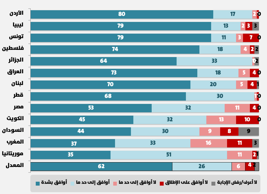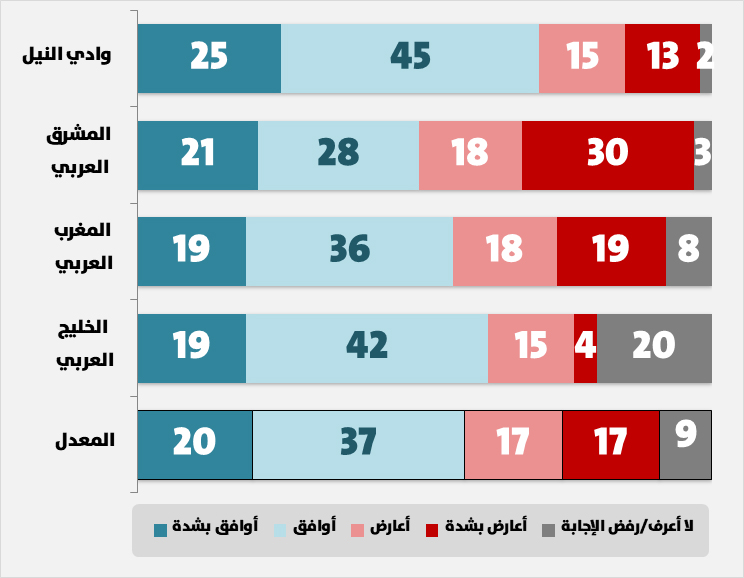 اتجاهات الرأي العامّ العربي نحو اعتراف بلدانه بإسرائيل، بحسب أقاليم المنطقة العربية