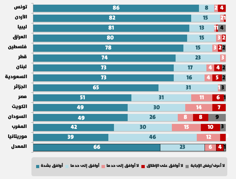 أما على صعيد الاعتراف بإسرائيل والتطبيع معها، فإن النتائج أظهرت أنّ 84% من مواطني المنطقة العربية يرفضون الاعتراف بإسرائيل، وفسّر الذين يعارضون الاعتراف بها موقفهم بعددٍ من العوامل والأسباب؛ معظمها مرتبطٌ بطبيعتها الاستعمارية والعنصرية والتوسعية. وتُظهر النتائج أنّ آراء المواطنين الذين يرفضون الاعتراف بإسرائيل لا تنطلق من مواقف ثقافية أو دينية. ومن الجدير بالذكر أن الرأي العام بحسب أقاليم المنطقة العربية مُجْمع، بنسب متقاربة، على رفض الاعتراف بإسرائيل.