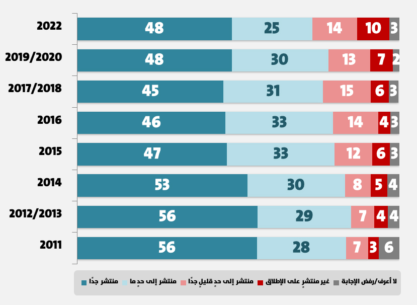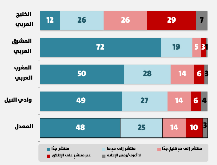 اتجاهات الرأي العامّ نحو مدى انتشار الفساد المالي والإداري بحسب أقاليم المنطقة العربية