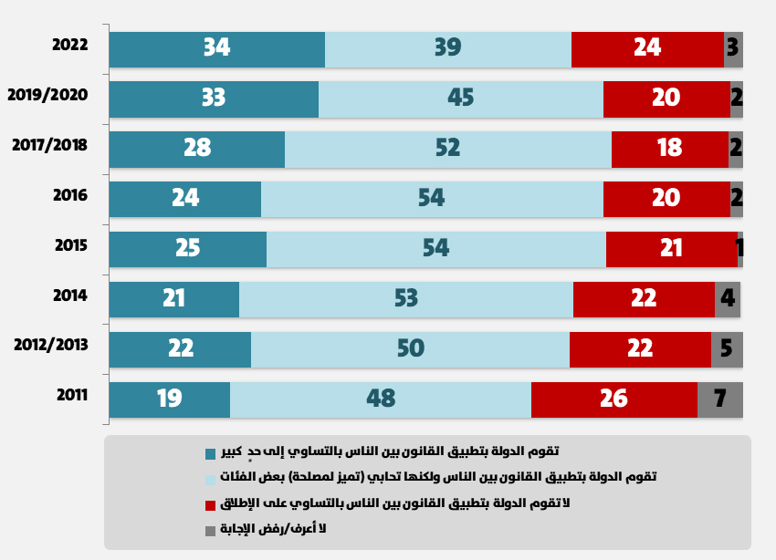 اتّجاهات الرّأي العامّ نحو مدى تطبيق الدولة للقانون بالتساوي بين الناس في استطلاعات المؤشر عبر السنوات
