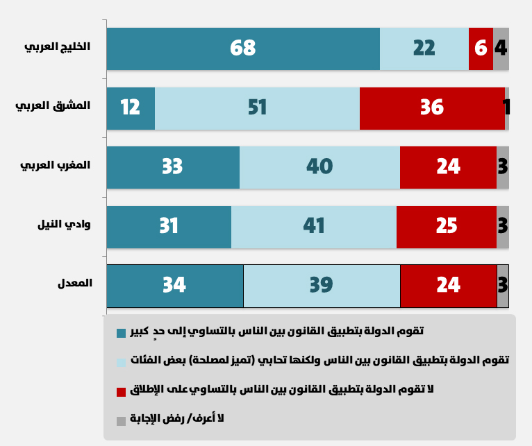اتّجاهات الرّأي العامّ نحو مدى تطبيق الدولة للقانون بالتساوي بين الناس بحسب أقاليم المنطقة العربية