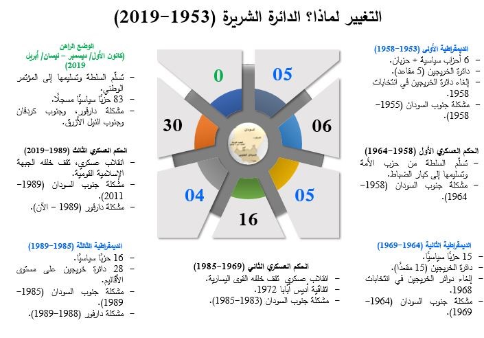 يرى بعض الباحثين والمحللين السياسيين أنَّ التغيير في أنماط التفكير السياسي والبناء الهيكلي لمؤسسات الدولة السودانية قد أضحى ضرورة ملحَّة؛ للخروج من دائرة الفشل السياسي المتكرر إلى رحاب ديمقراطية مستدامة، آخذين في الحسبان أن السودانيين قد بدؤوا تجربة المشاركة الوطنية في الحكم بانتخابات عام 1948 لاختيار أعضاء الجمعية التشريعية، باعتبارها خطوةً تأسيسية تجاه الحكم الذاتي في ظل الاستعمار الإنكليزي-المصري (1898-1956)، وأعقبتها انتخابات مجلس النواب والشيوخ عام 1953، التي مثلت الانطلاقة الديمقراطية لقيام أول حكومة وطنية منتخبة، كان لها شرف إعلان الاستقلال من داخل البرلمان في 19 كانون الأول/ ديسمبر 1955. وجاءت بعدها انتخابات عام 1958 بوصفها خطوةً تجاه تمكين الممارسة الديمقراطية الوليدة، إلا أن الصراع الحزبي على السلطة أفضى إلى انهيار تلك التجربة، عندما سلَّمت قيادة حزب الأمة دفَّة الحكم إلى قيادة القوات المسلحة التي حكمت السودان مدة ستة أعوام (1958-1964)، شهد السودان خلالها انتخابات المجلس المركزي عام 1962؛ لإضفاء نوعٍ من الشرعية على الحكم العسكري الذي عارضته معظم القطاعات السياسية والحزبية.