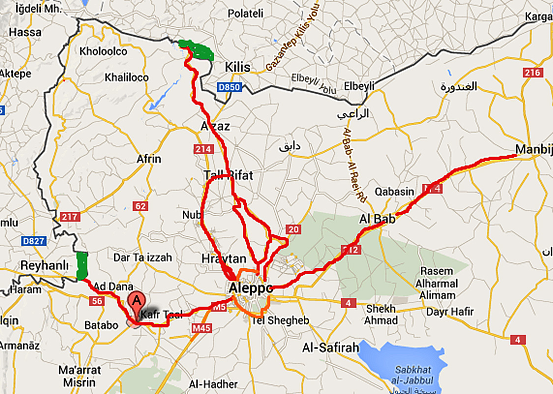 الخطوط الحمراء: طرق الإمداد الرئيسة لمدينة حلب (الباب شرقًا، أعزاز شمالًا، الأتارب وباب الهوى غربًا).