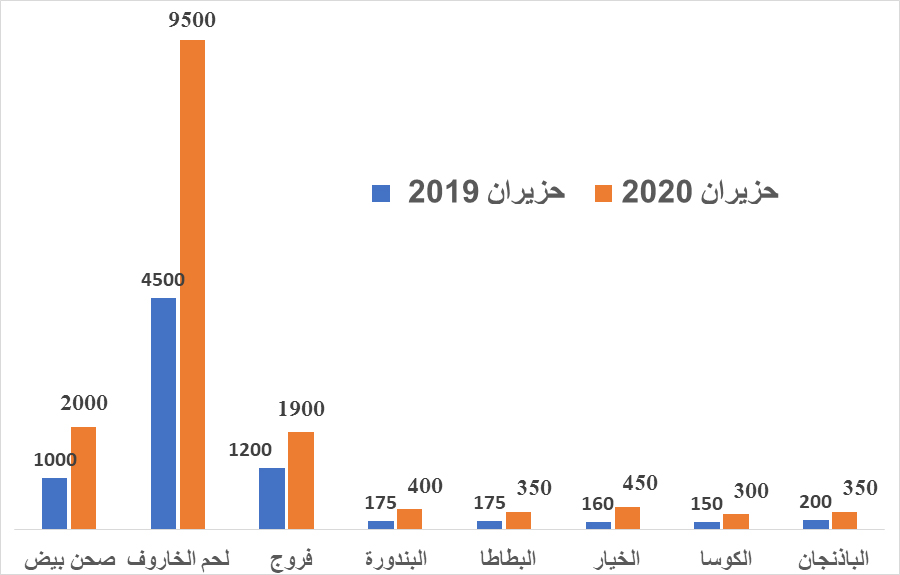 المصدر: "رصد لأسواق الخضار والفواكه بالعاصمة دمشق"، موقع اقتصاد، 17/6/2020، شوهد في 1/7/2020، في: https://bit.ly/2VASkrs ؛ "إليكم نشرة أسعار الفواكه والخضار في العاصمة دمشق.. والأسعار تسجل تراجعًا بنسبة 50%"، موقع b2b-sy، 15/6/2019، شوهد في 3/7/2020، في: https://bit.ly/38qw6xV