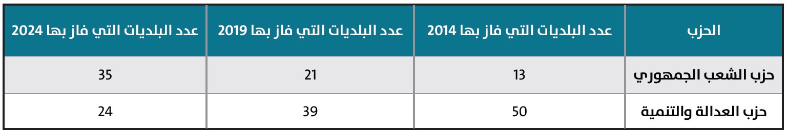ومع أن حزب العدالة والتنمية حصل في الانتخابات الأخيرة على 35.5 في المئة، وهي نسبة مماثلة تقريبًا لما حصل عليه في انتخابات أيار/ مايو 2023 العامة (35.6 في المئة)، فإن المقارنة يجب أن تكون بالانتخابات البلدية السابقة عام 2019 (44.3 في المئة)؛ ما يعني أن الحزب خسر نحو 10 في المئة من الكتلة الناخبة، حيث يرتبط التصويت في الانتخابات البلدية بصورة أكبر بالواقع المعيش.