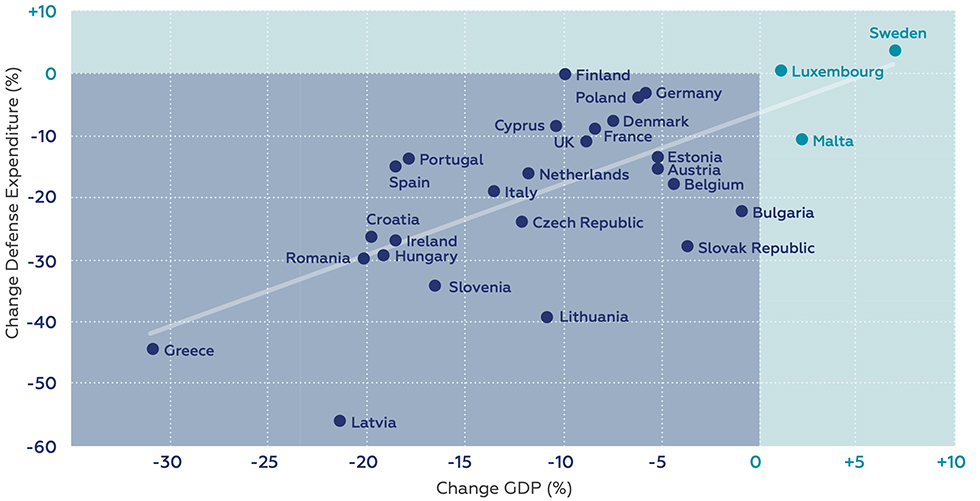 FIGURE 1: EU28 GDP AND DEFENSE EXPENDITURE CHANGES 2008-2012[1]