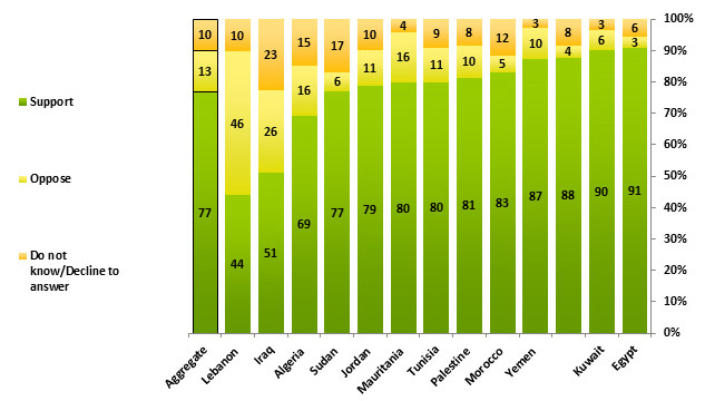 The results further indicate that the majority in 12 of the 13 countries surveyed, supported this conclusion. The only exception was Lebanon, with public opinion being divided: 44% of the Lebanese population surveyed supported removing Assad while 46% were opposed to his leaving power. In some countries-Egypt, Kuwait, Yemen, Saudi Arabia, Morocco, Palestine, Jordan, Sudan, Algeria-support for Assad leaving power was nearly unanimous. In Egypt, 91% of the population supported Assad's downfall, as did 90% of Kuwaiti respondents, 88% of Saudi respondents and 87% of Yemeni respondents.