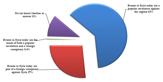 When it came to describing the events in Syria, responses to the survey show that a majority of 62% of Arab public opinion agreed with the statement "Events in Syria today are a popular revolution against the regime". Meanwhile, 27% of respondents selected the statement "Events in Syria today are the result of a foreign conspiracy against the country". Less than 1% of the respondents indicated that events in Syria were the result of both a foreign conspiracy and a popular revolution, while 11% of the respondents declined to provide an answer.